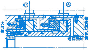 而被密封的氣體由A口引入,經(jīng)密封端面外徑向內(nèi)徑方向泄漏,泄漏的氣體經(jīng)管口C排向火炬。大氣側(cè)的密封端面僅僅密封火炬和大氣之間很低的壓力差,所以由大氣側(cè)密封向內(nèi)徑側(cè)泄漏的氣體是數(shù)量的。當(dāng)被密封的氣體比較臟時(shí)候,一個(gè)迷宮密封應(yīng)該裝在被密封介質(zhì)側(cè)的前邊。高壓被密封的工藝氣體經(jīng)過(guò)濾后,通過(guò)管口A引入密封內(nèi)。