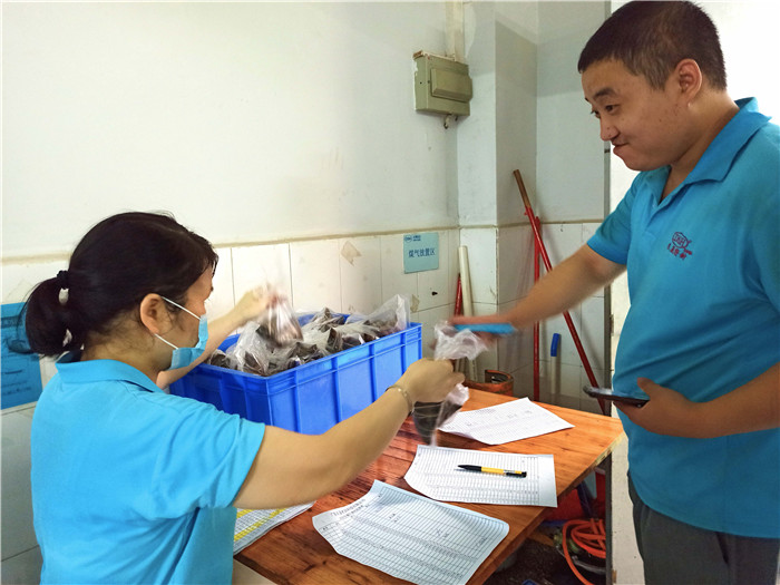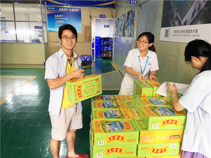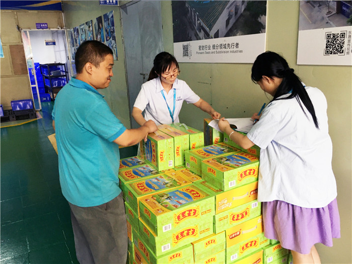臨近下班,員工們有秩序的在拿取,東晟密封為他們而準(zhǔn)備的消暑飲品與端午粽子。